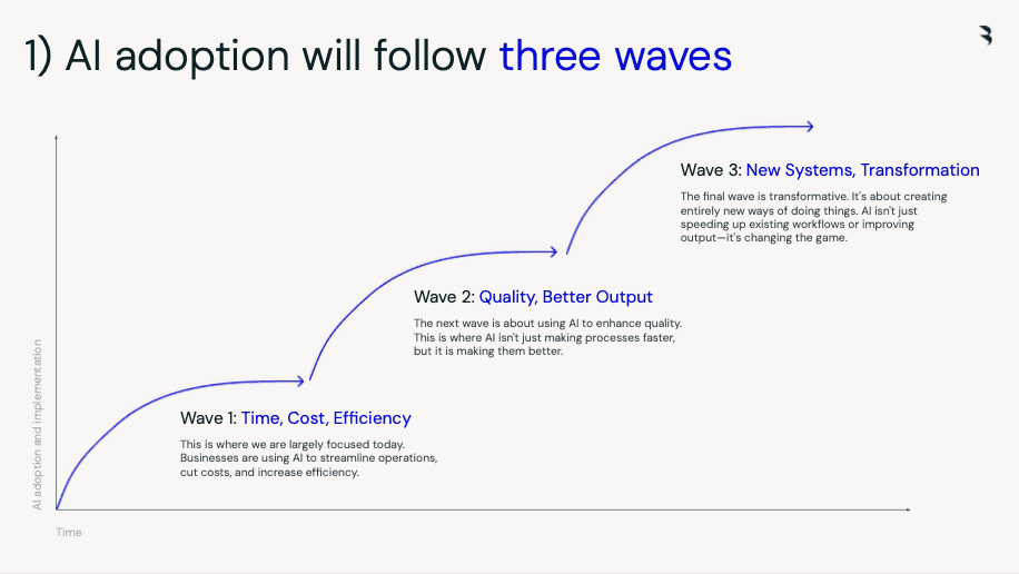 Enhanced output quality: The second wave expands beyond mere efficiency, focusing on significantly improving the quality and effectiveness of outputs. Here, AI doesn't just speed up processes—it enhances the depth, precision, and overall quality of business outcomes (e.g., better predictive insights, more creative marketing, more accurate forecasting).