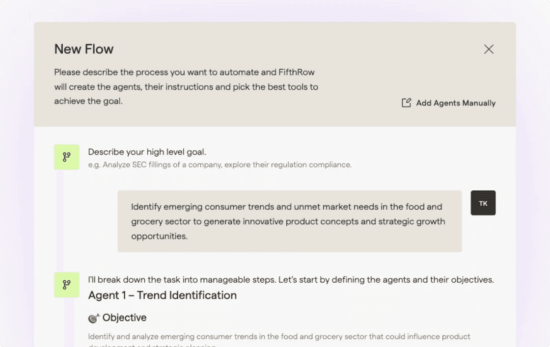 The new chatbot-style Generate Flow is now live. Just describe what you want, and FifthRow will structure it into a working Flow template — ideal for both technical and non-technical users. Try it out yourself – Create a New Flow.
