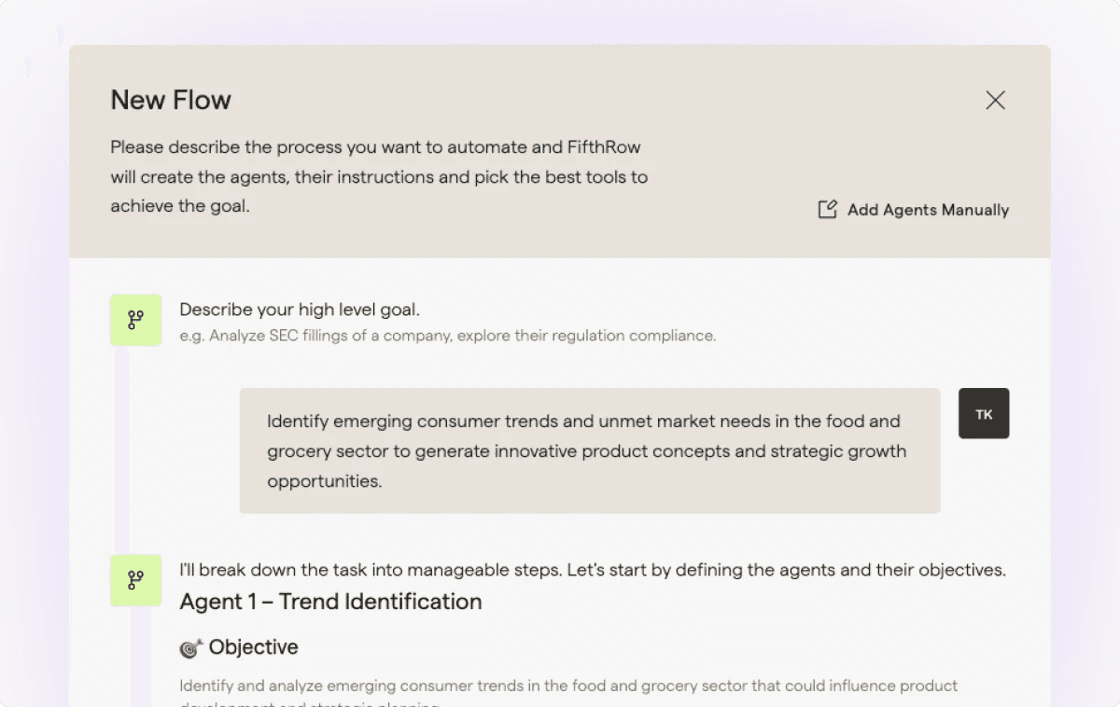 The new chatbot-style Generate Flow is now live. Just describe what you want, and FifthRow will structure it into a working Flow template — ideal for both technical and non-technical users. Try it out yourself – Create a New Flow.