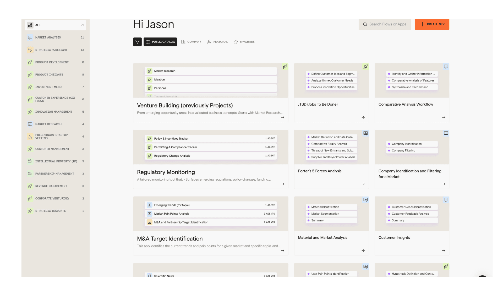 Breadth. The foresight run is only one of more than 90+ Apps and Flows that cover everything from venture building to regulatory monitoring and competitive wargaming. Each sits one click away in the same catalog.